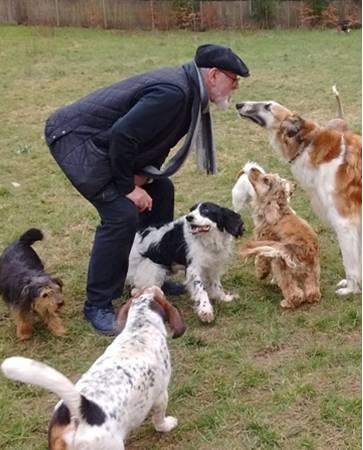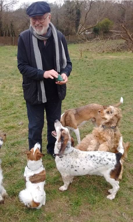 Our patron Peter Egan popped in with a much appreciated gift of food and treats, kindly donated from another Rescue that couldn’t make use of it. Here is Peter at the helm of the wheelbarrow with some of the goodies. Then we went up the field so he could meet our dogs and as you can see, he had a fascinating conversation with Kismet who doesn’t usually take to new people, but the dogs recognised a genuine animal lover.
